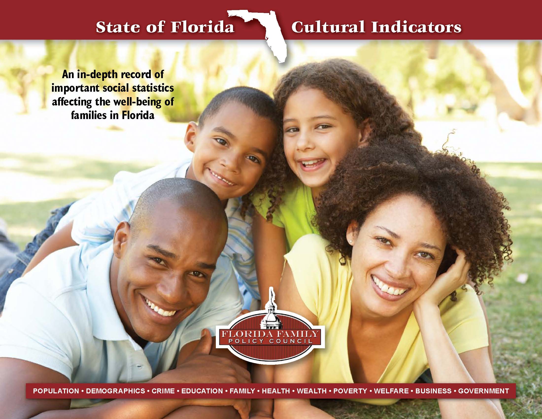 The 55-page full-color document provides statistical data for 37 cultural indicators in seven different categories including vital statistics, crime, education, family, health, poverty & welfare, and business & government. Each indicator compares Florida’s status to the rest of the country by using charts, graphs and graphic color images to accompany the raw data.