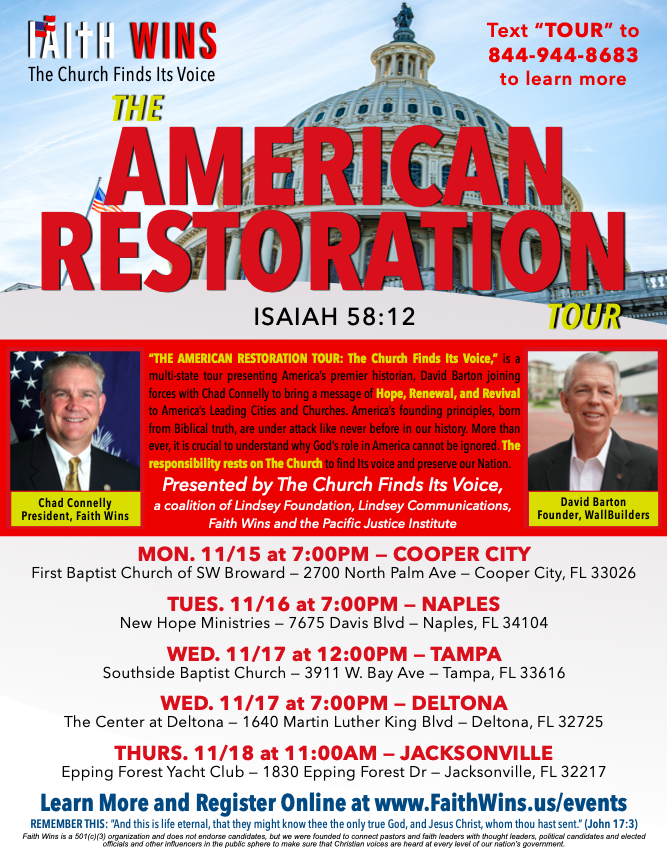 Join us for The American Restoration Tour, an event designed to civically engage pastors, featuring America’s premier historian David Barton of WallBuilders. This event, also presented by Chad Connelly of Faith Wins, will expound on the Christian roots of American history and will take place in 5 locations throughout Florida from Nov. 15th -18th.