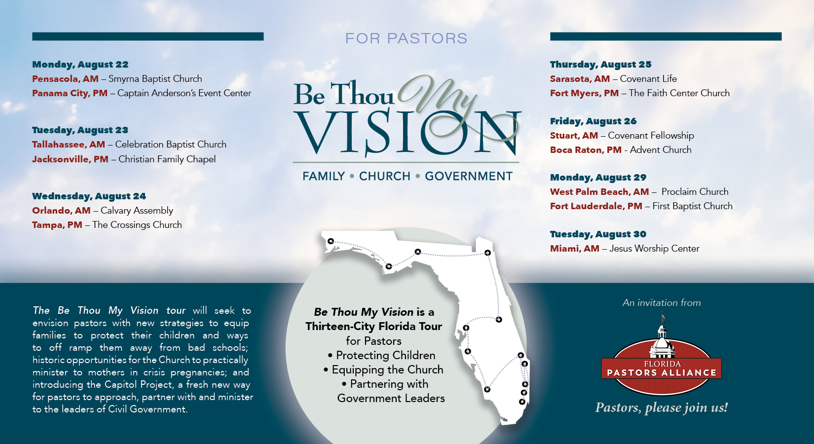 The Be Thou My Vision Tour, sponsored by the Florida Pastors Alliance, is a 13-city tour seeking to help pastors envision new strategies to equip families to protect their children, including: