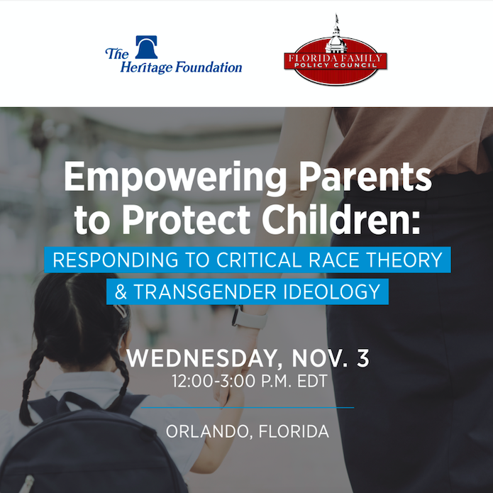 As parents assert their primary responsibility to protect their children, they face escalating pressure from teachers and administrators at the local level and from the department of justice at the national level. What is it about CRT and gender ideology that cannot withstand scrutiny from parents and concerned citizens? What can we do about it? Join The Heritage Foundation and Florida Family Policy Council for a luncheon on CRT, Gender Identity, and the parental responsibility to protect and educate their children.