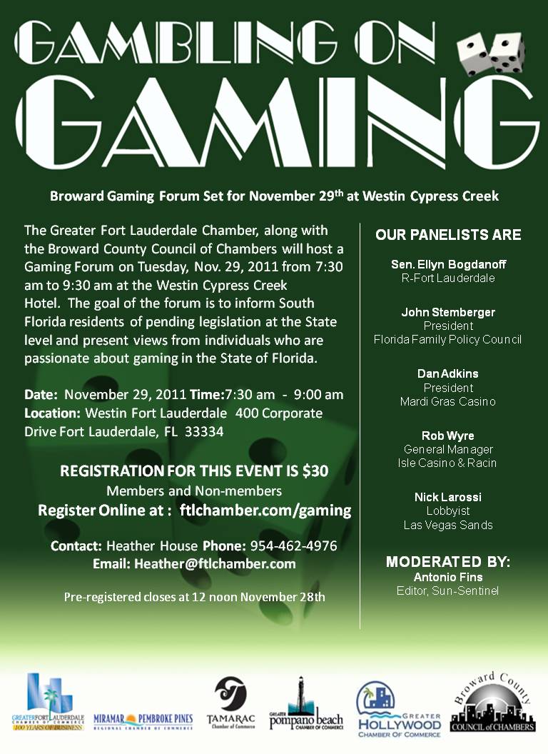 Other co-sponsors of the forum on gaming include the Mirmar/ Pembroke Pines Chamber of Commerce, Tamarac Chamber of Commerce, Greater Pompano Beach Chamber of Commerce, Greater Hollywood Chamber of Commerce, Coral Springs Chamber of Commerce and the Broward County Council on Chambers.