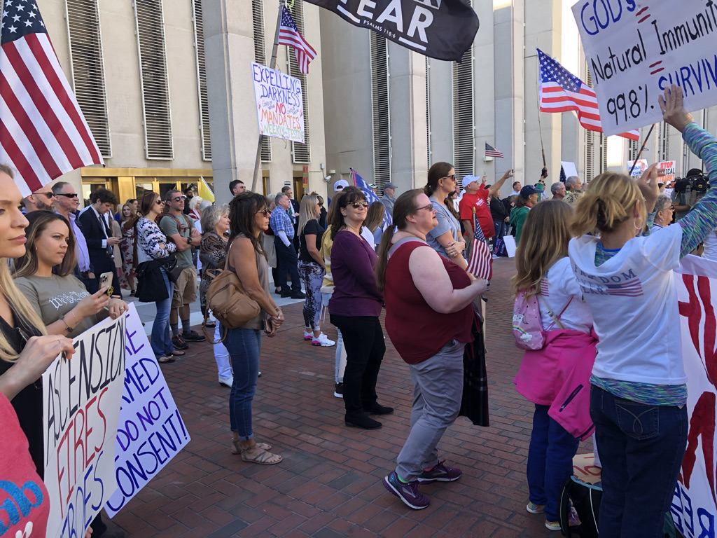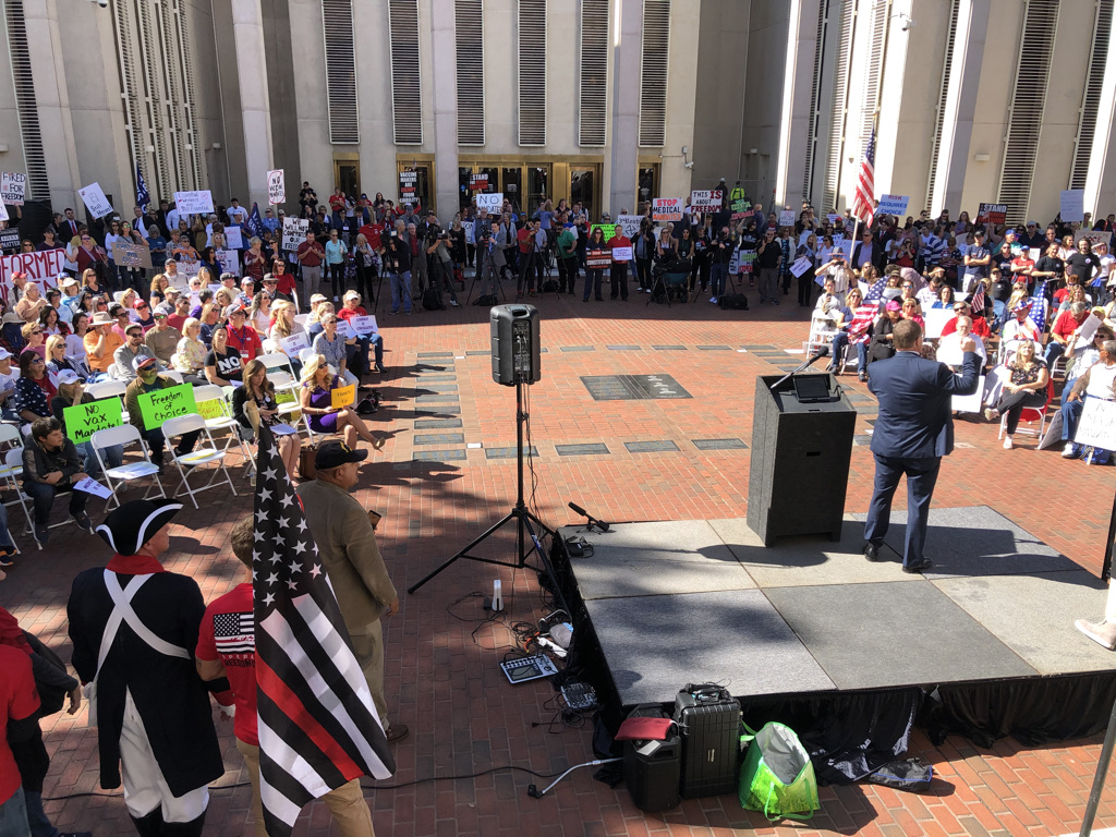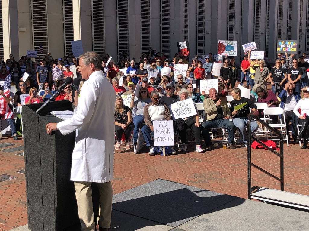DeSantis’s signing of the bills came following a coalition of 700 supporters rallying at the Capitol to oppose vaccine mandates. Florida Family Policy Council and 24 sponsors organized the rally. Twenty speakers addressed the crowds including physicians, fire fighters, employees, and mothers. Speaker highlights included Alfie Oaks of Seed to Table, family physician Dr. John Littel, fire chief Stephen Davis, and Patti Sullivan with Parental Rights Florida. In closing, President and General Counsel of FFPC, John Stemberger, invited approximately fifty employees who had lost their jobs after facing vaccine mandates to the front to pray for them.